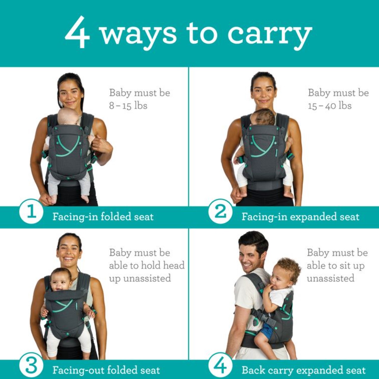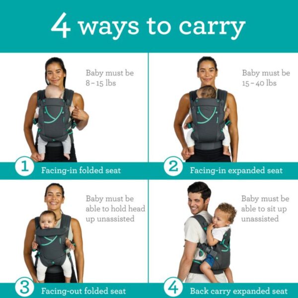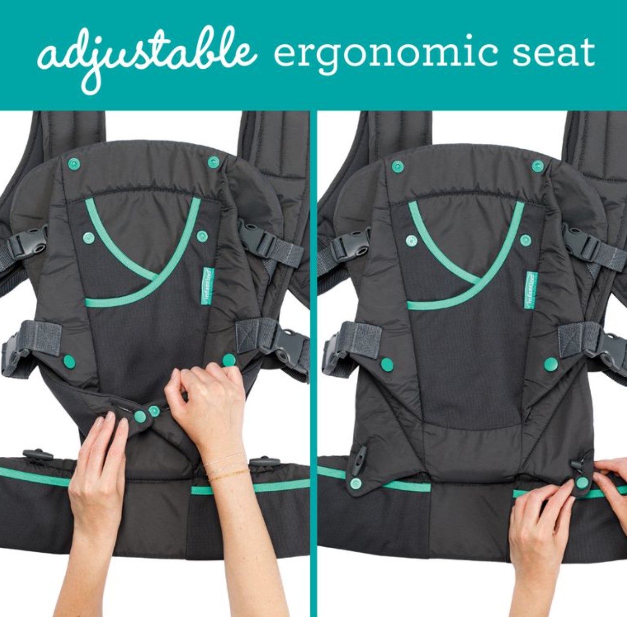 5種揹法 頭部支撐,份外舒適 帶襯墊的肩帶和支撐腰帶,用於分散重量和緩解壓力 可收納的袋子,增加隨時可由揹帶變作座椅的便攜性 可輕鬆拆卸揹帶主體的易於開/關的拉鍊和帶扣系統 腰帶上有方便、易於拿取的側邊口袋 高級握感物料 – 提供防滑功能及提升舒適度 可調節部分: 可調加寬軟墊肩帶 (最短27吋,最長50吋) 可調節腰部支撐腰帶 (最小 28吋 – 最長41吋)