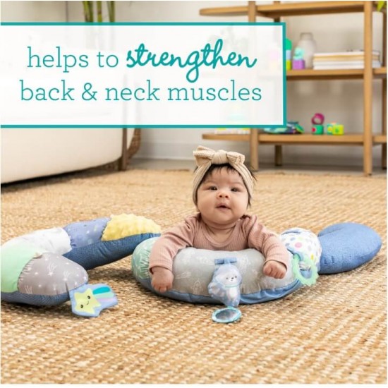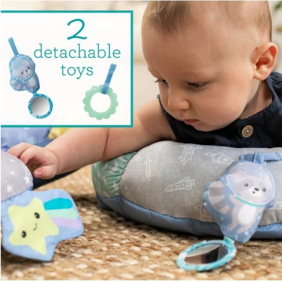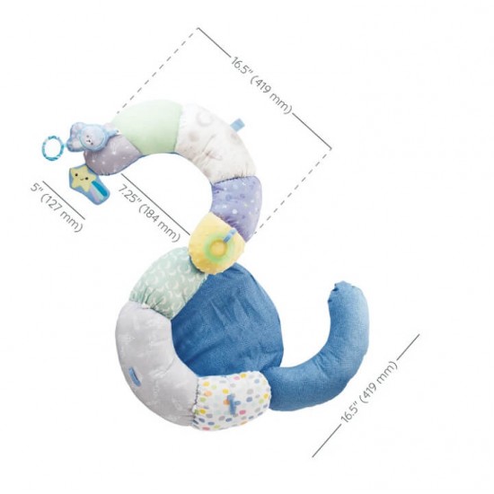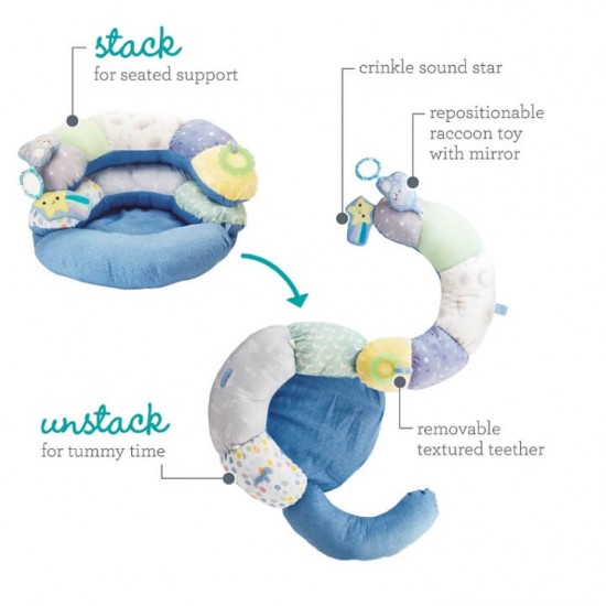 適合初生嬰兒使用 2 個可隋意裝配及固定的玩具 鏡子可吸引寶寶注意 不含 BPA 的柔軟矽膠牙膠 可堆疊成一個 “C” 靠墊來安全地支撐寶寶坐姿 支撐枕在趴睡時間,有助鍛鍊頭頸部肌肉