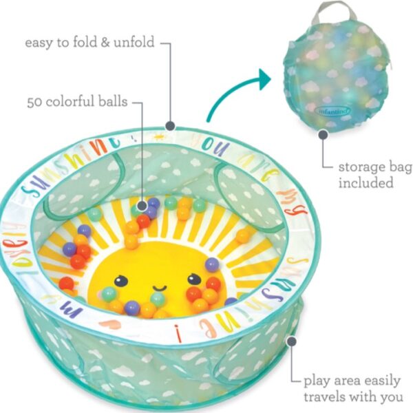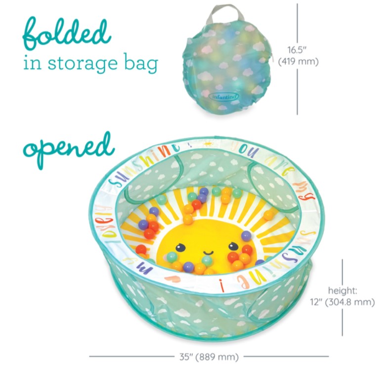 寬敞的 35 英寸 (~ 89厘米)直徑提供充足的遊戲空間 配有 50 個彩色球,帶來即時樂趣 易於折疊和展開,可快速安裝和存放 包含一個方便的收納袋,方便攜帶 明亮、多彩的設計,促進運動技能發展
