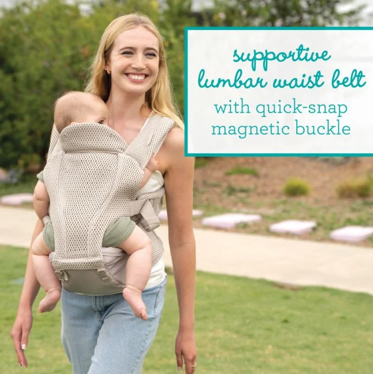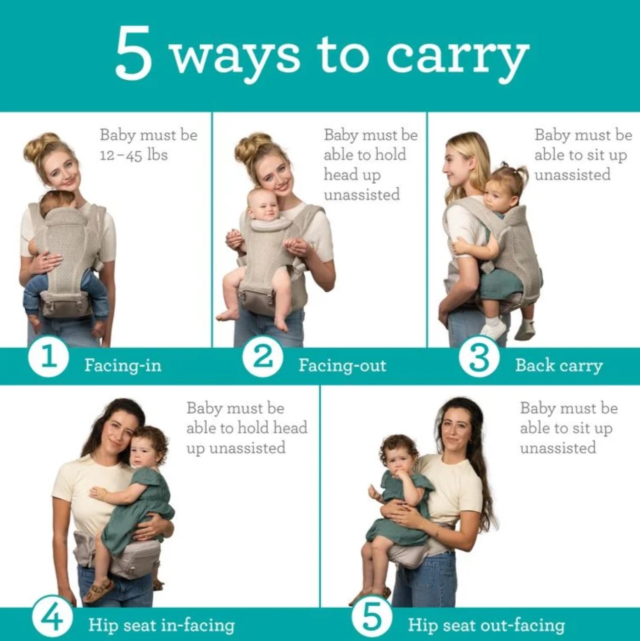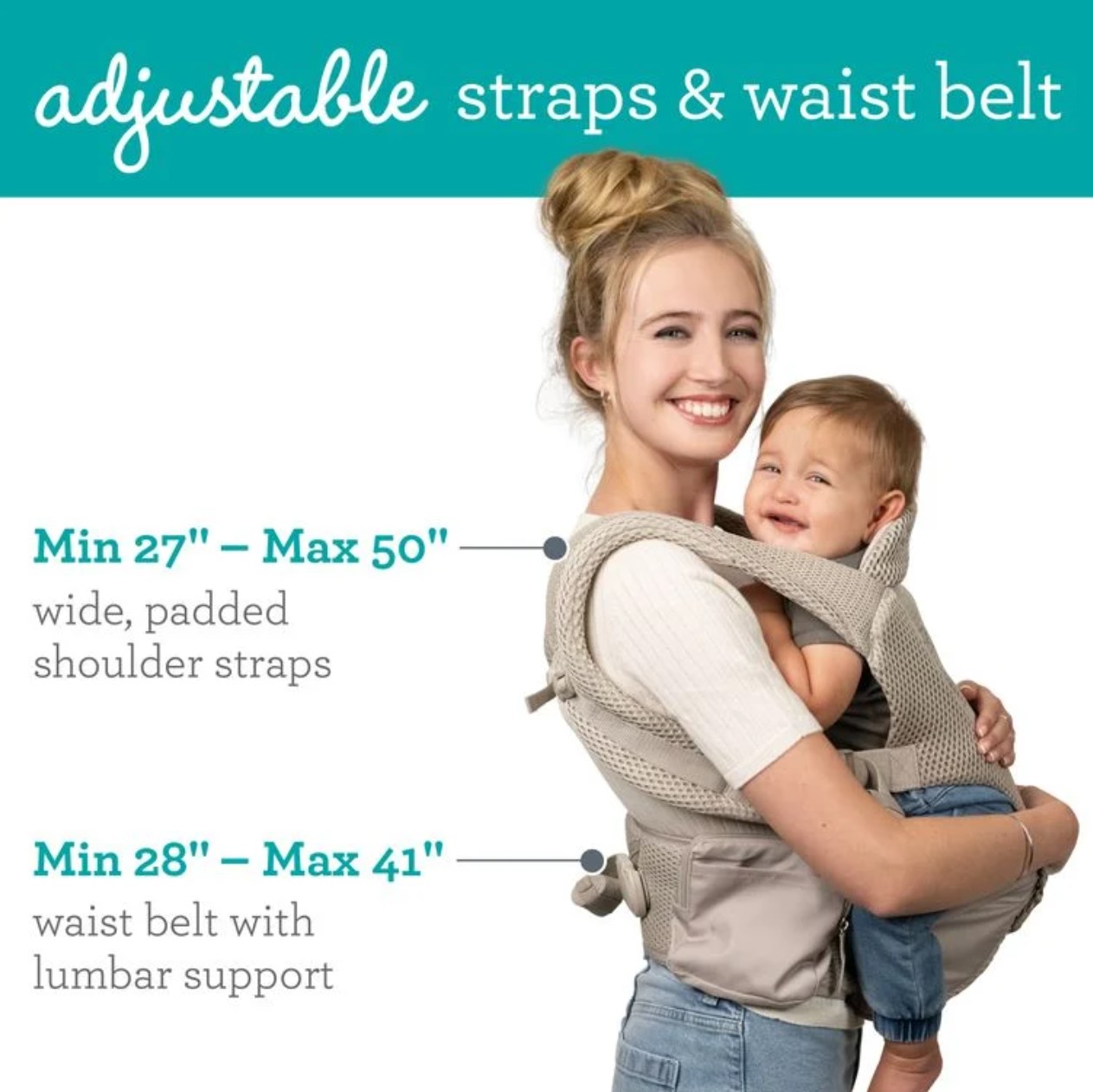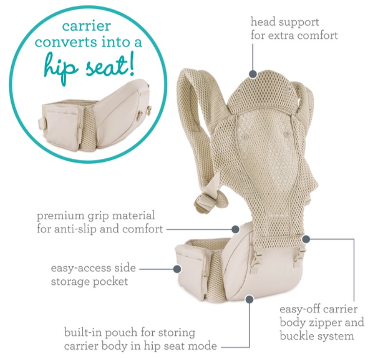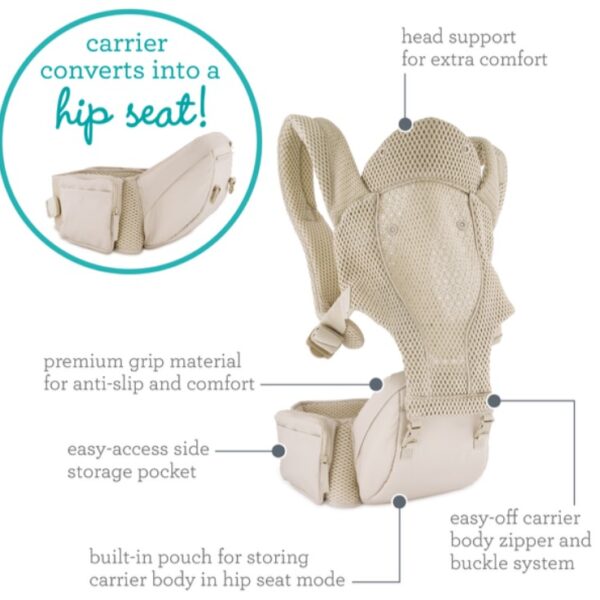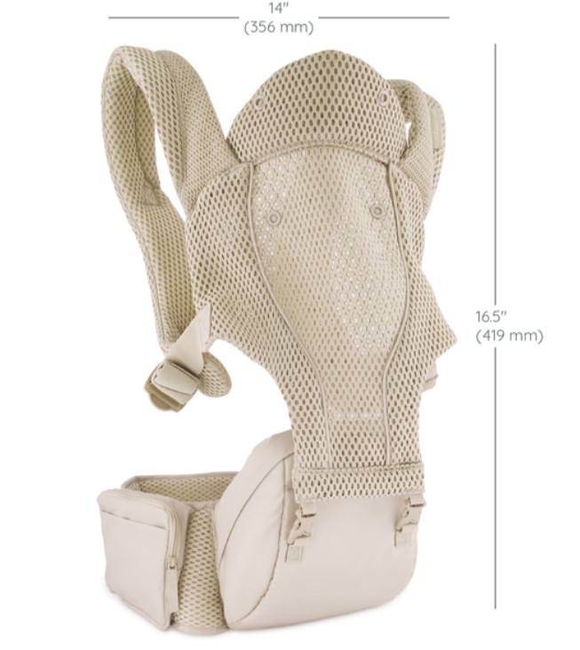 5種揹法 頭部支撐,份外舒適 帶襯墊的肩帶和支撐腰帶,用於分散重量和緩解壓力 可收納的袋子,增加隨時可由揹帶變作座椅的便攜性 可輕鬆拆卸揹帶主體的易於開/關的拉鍊和帶扣系統 腰帶上有方便、易於拿取的側邊口袋 高級握感物料 – 提供防滑功能及提升舒適度 可調節部分: 可調加寬軟墊肩帶 (最短27吋,最長50吋) 可調節腰部支撐腰帶 (最小 28吋 – 最長41吋)
