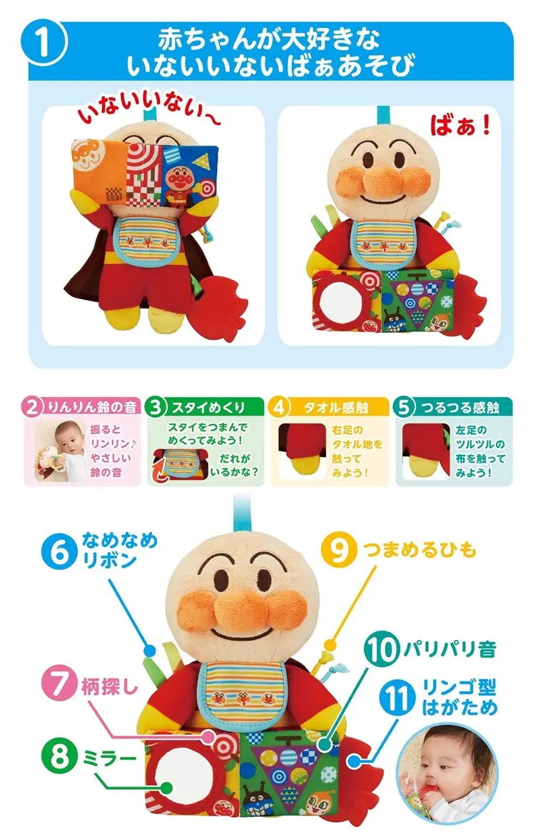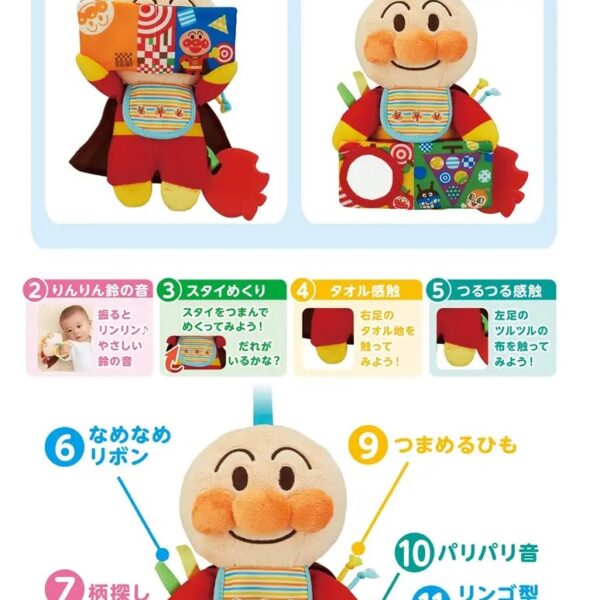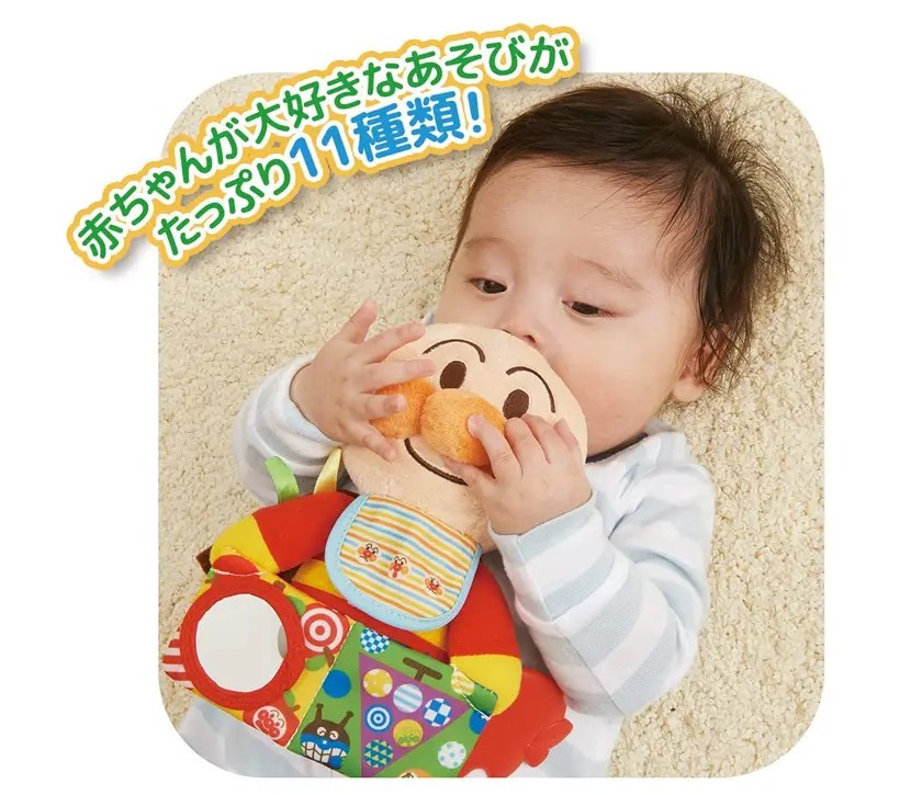11種玩法,還可以掛在嬰兒車上遊玩! 1) 看不到臉捉迷藏 2) 鈴鈴的聲音 3) 毛巾的觸感 4) 滑順觸感 5) 可愛的緞帶 6) 尋找顏色 7) 小鏡子 8) 可以拉的細繩 9) 脆脆的聲音 10) 流口水巾 11) 蘋果型牙咬