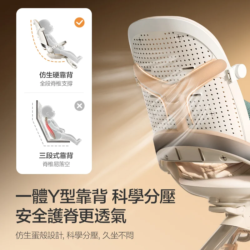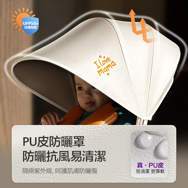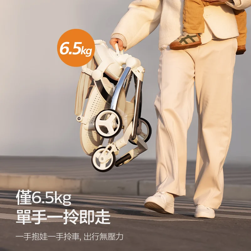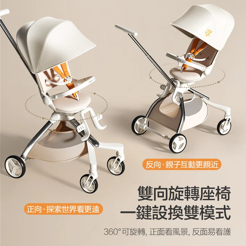 獨特360°雙向旋轉座椅、95-175度三檔躺平設計與4段調節拉柄,隨心切換,陪伴寶寶不同成長階段與出行場景(城市、社區、公園、短途旅行等)。內置彈簧減震及多重避震系統,採用PU天然橡膠輪,一腳雙剎設計,保障推行平穩與寶寶安全。