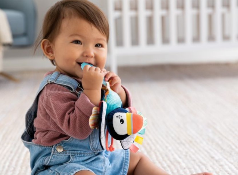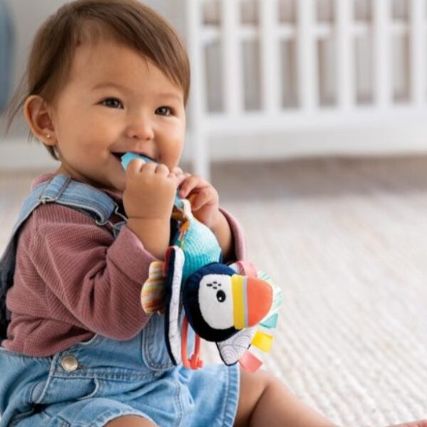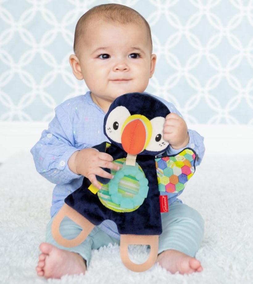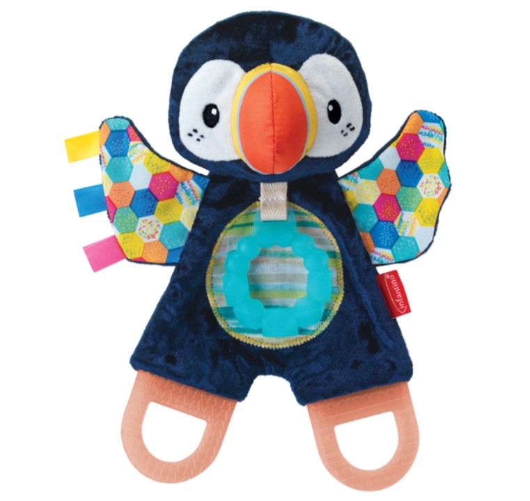 尺寸完美,適合出牙和抱著; 不含 BPA 的紋理矽膠牙膠; 紋理磨牙腳; 大膽而對比鮮明的皺巴巴的翅膀; 優質,必須觸摸紋理