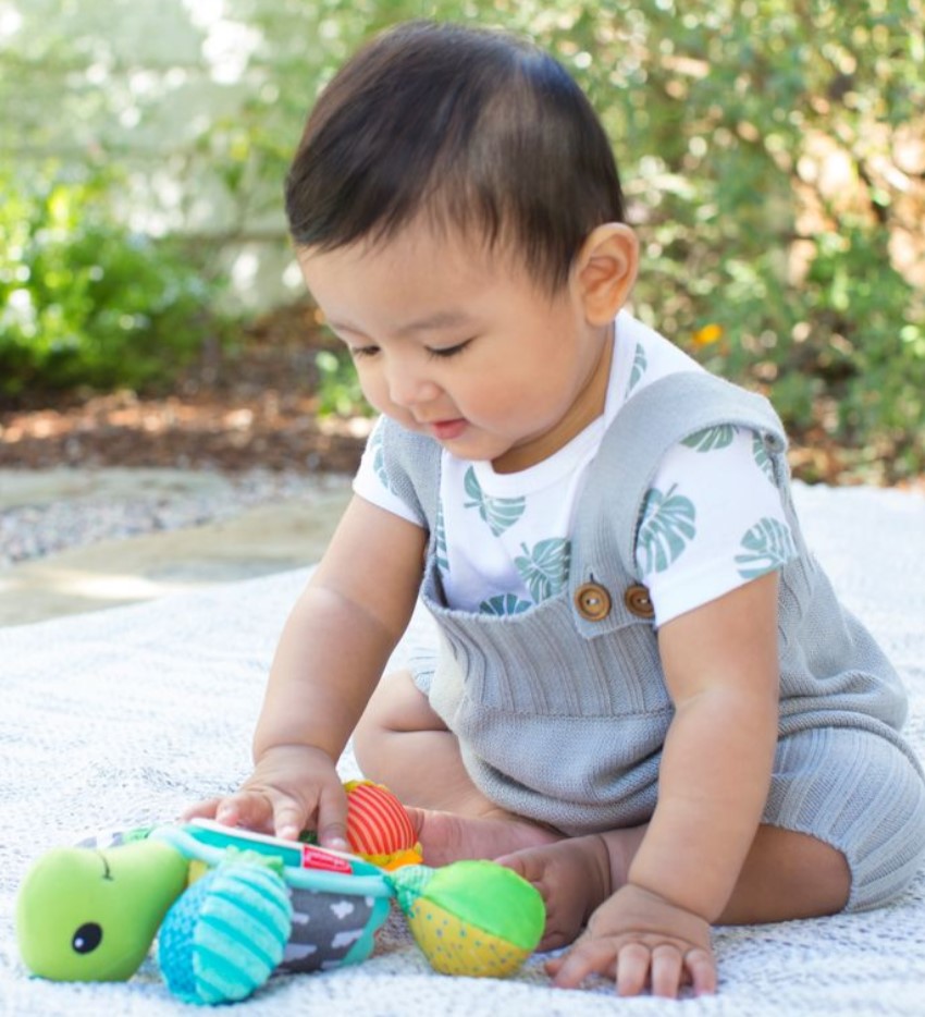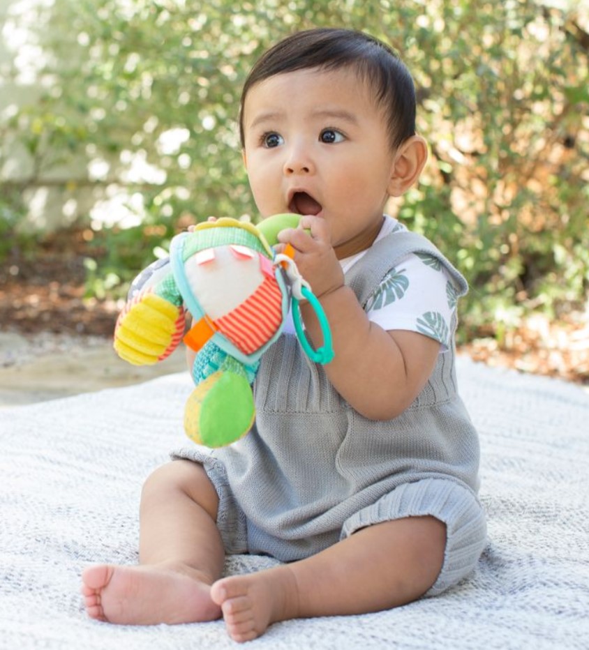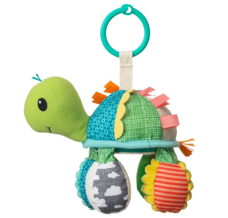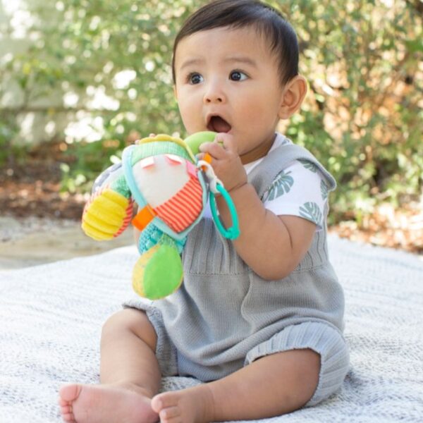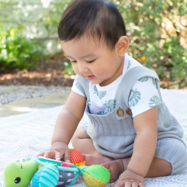 有趣吸引的搖鈴和褶皺聲有助啟發探索 明亮刺激的色彩配搭 帶鏡子的肚子,適合玩躲貓貓遊戲 易於安裝到汽車座椅或嬰兒車上