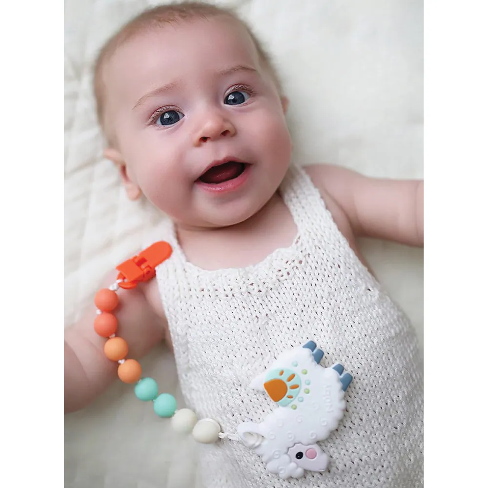 這款牙膠能舒緩寶寶長牙不適,同時配有奶嘴鏈確保奶嘴衛生不遺失。
