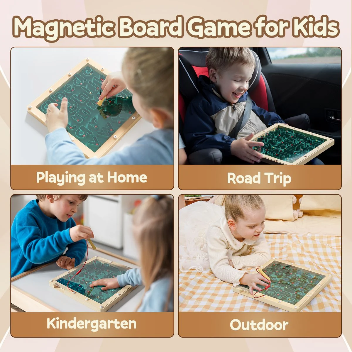 採用環保櫸木材質,表面塗有水性漆,安全無毒。 28×28公分的緊湊設計便於攜帶,密封的珠子設計確保不會散落。